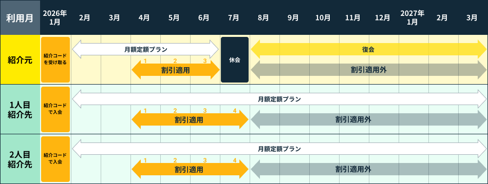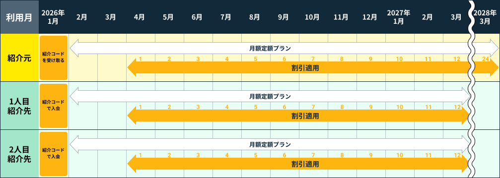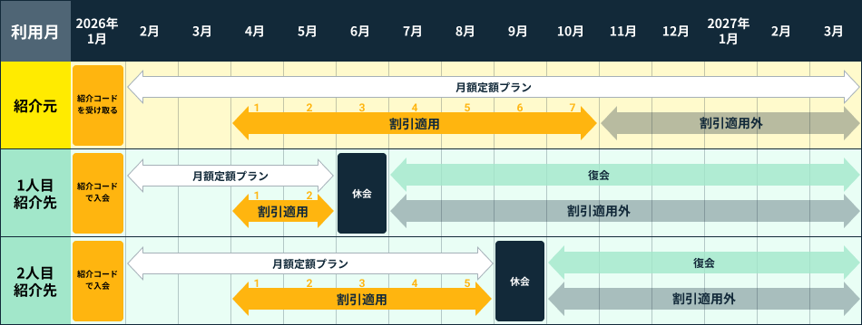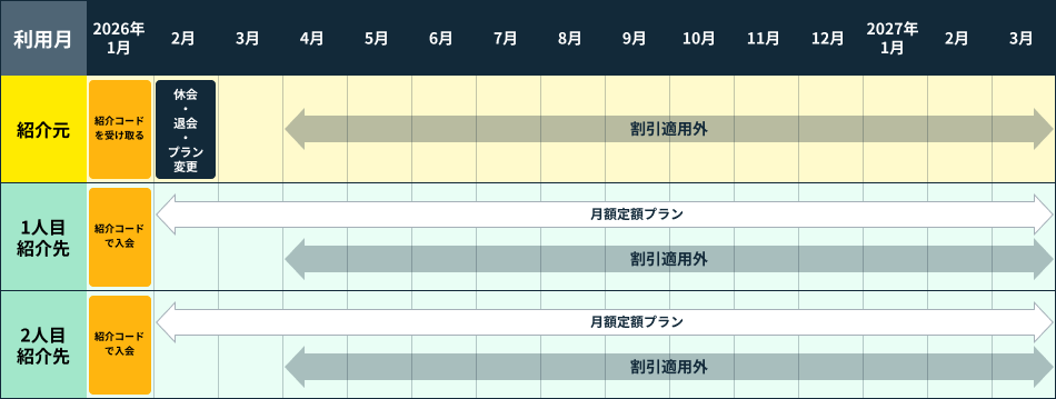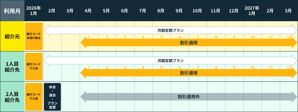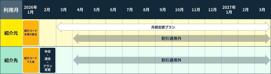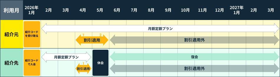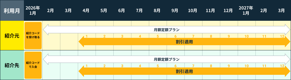 紹介元・紹介先それぞれが、2026年2月1日以降、12ヶ月間月額定額プランを継続した場合の割引適用月