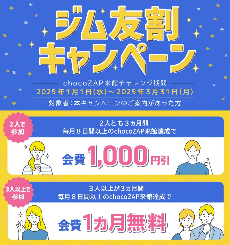 chocoZAPのジム友割キャンペーンではchocoZAPで一緒に運動をはじめる方を応援します!
