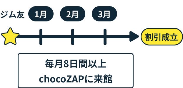成立したジム友間でchocoZAPに登録されたお名前 (姓名の「名」のみ) が共有されます。ご理解いただいた上で、キャンペーンへのご参加をお願いいたします。また本キャンペーンをご紹介されるご家族・ご友人にも必ずお名前が共有されることをお伝えの上、ご招待ください。
