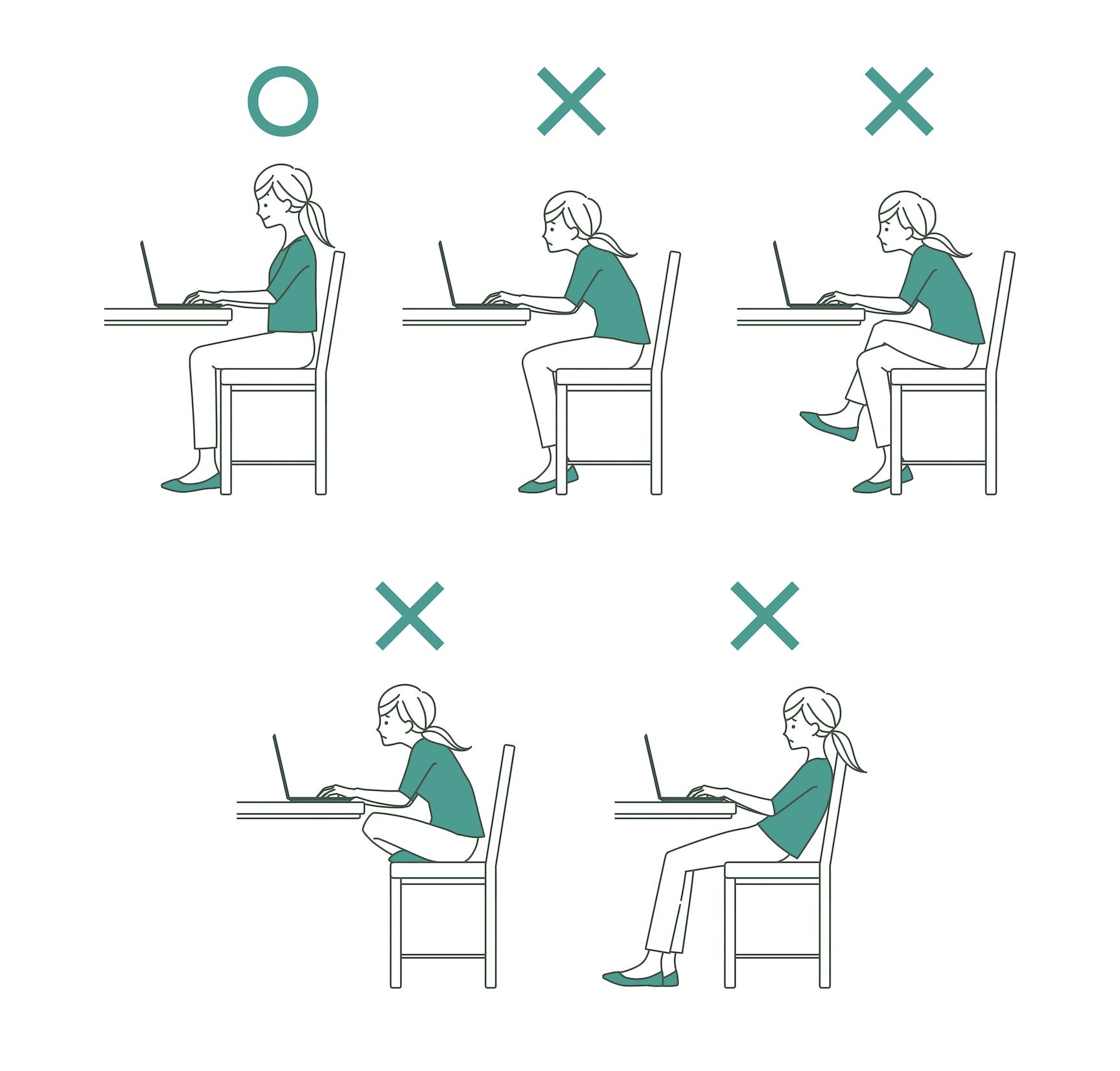 椅子に座る時は、骨盤を土台として、その上に背骨がまっすぐ伸びているイメージを持ちます。筋肉で無理に支えようとせず、骨格で支えるイメージを持つことがポイントです。ただし、常に同じ姿勢をキープし続ける必要はなく、時々意識的に正す程度で十分です。