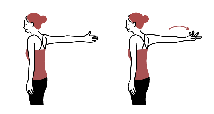 壁に沿って立ち、腕を後ろに伸ばして手のひらを壁につけます。ゆっくりと手のひらを上に向けたら、呼吸をしながら30秒その状態をキープします。内側に丸まりがちな肩が開き、血行促進が期待できます。左右それぞれ5回程度行いましょう。