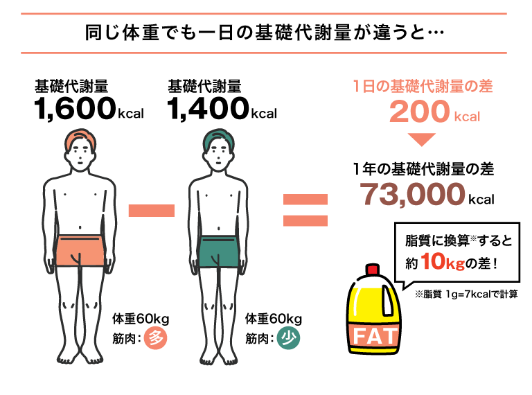 筋肉量と基礎代謝量は比例するので、筋肉量が多いほど何もしなくてもエネルギーを消費してくれるようになり、太りにくい体づくりが可能になります。