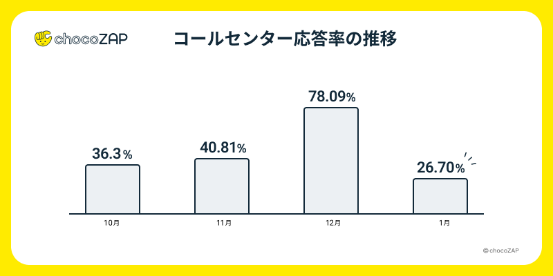 チャットボットのご利用も広がってきておりますが、年末年始明けにかけてお電話によるお問合せを多くいただいた為、2025年1月度の応答率は26%となっております。