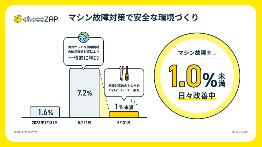 chocoZAPにおけるマシンの故障率は、当初(今年1月末)で1%程度で推移していましたが、この春先から発生した海外からの交換用機材の納品遅れの影響により、故障率は一時的に高くなり、5 月末 7.2%となっておりました。この時期に、ご希望のマシンが利用できずご不便をおかけした一部の会員の皆様には、深くお詫び申し上げます。 その後、緊急対応として新品機材への入れ替えや、交換用機材の調達、導入工程の見直しなど行い故障率の改善が進みましたが、さらに、マシン故障率および対応スピードを徹底的に改善させるため、全国各地の RIZAP トレーナーによる即時修理対応、マシンメンテナンス・修理対応のパートナー企業の拡大などあらゆる手を使って改善に取り組みました。これらの取り組みの結果、現在では故障率1%まで改善しており、今後は故障から48時間以内に修理を完了させる体制の整備を進めております。
