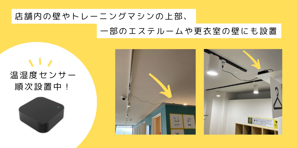 温湿度センサーは、店舗内の壁やトレーニングマシンの上部などに設置しております。