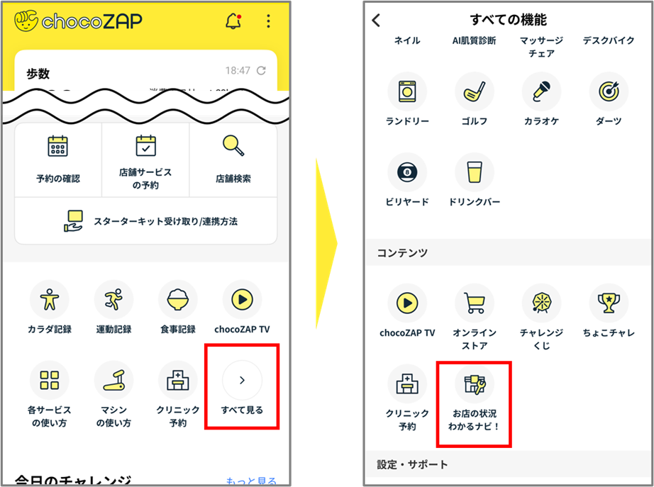 chocoZAP お店の状況わかるナビ!は、アプリの「すべての機能」またはchocoZAP サイトよりご確認いただけます。