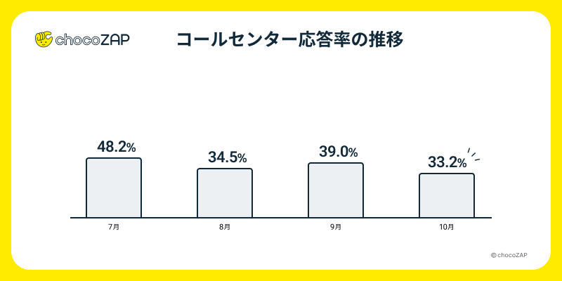 2025年10月度のコールセンターの応答率は33.2%となっております。より多くのお客様に快適にご利用いただけるよう、電話での対応に加え、チャットボットやサポートフォームによるお問い合わせ対応も行っております。