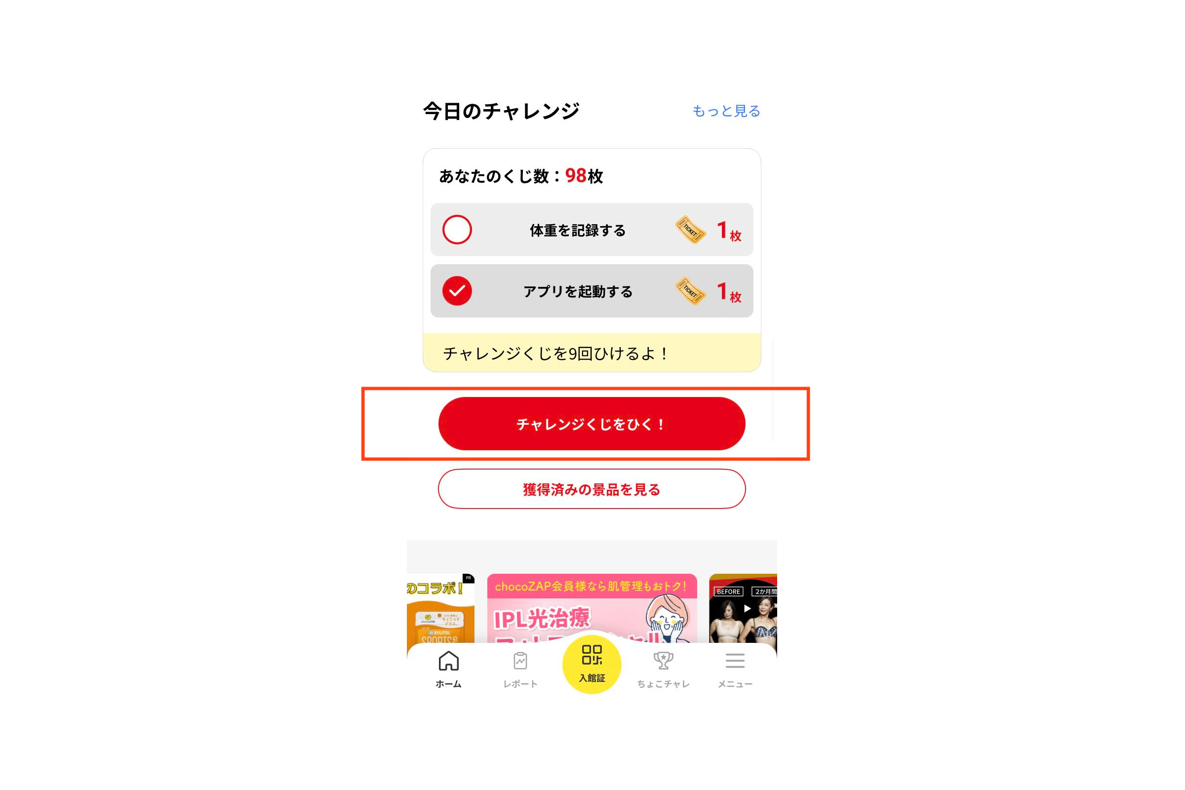 毎日chocoZAPアプリで体重を記録すると、最大限オトクにくじ券を集めることができますよ!