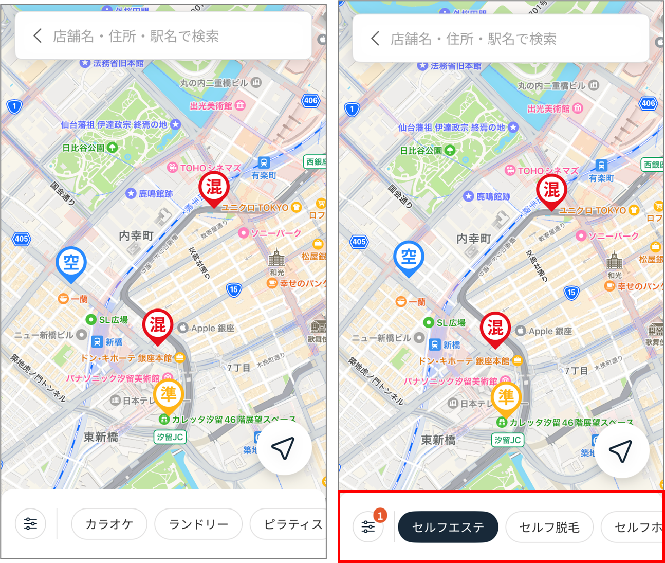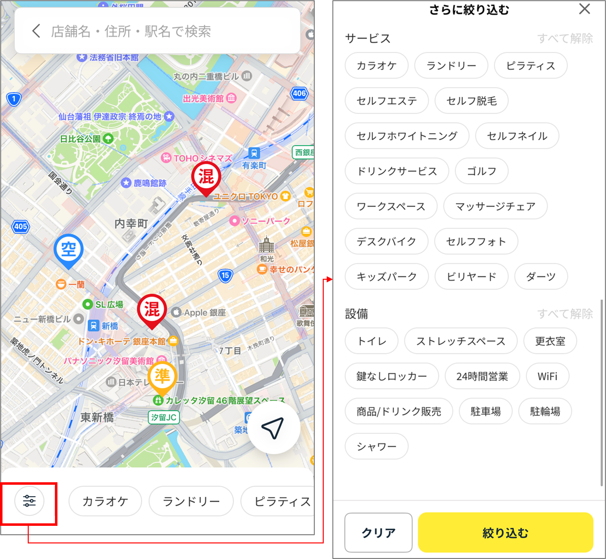 マップ下部にて簡単にサービスでの絞り込み検索ができるほか、店舗設備での絞り込み検索が可能です。