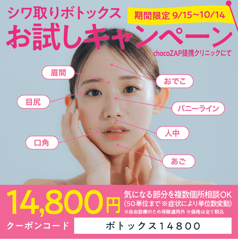 chocoZAPの会員様へ、お得にご利用いただける、提携医療機関のボトックスキャンペーンのご案内です。