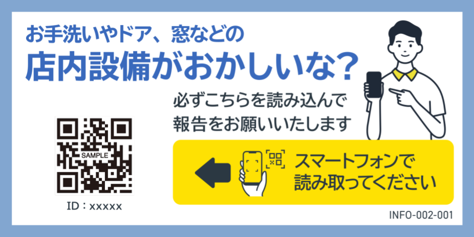なお、空調関連/トイレ/洗面台/ドア/照明 等、店舗設備に関する不具合や故障のご報告は、店舗入口付近に貼付されている設備報告QRコードよりご報告いただけますようお願いいたします。