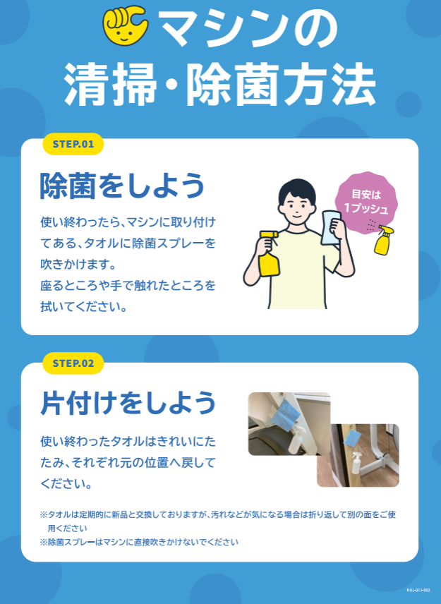 マシン使用後は、マシンに設置されているタオルに除菌スプレーを1プッシュ吹きかけてください。