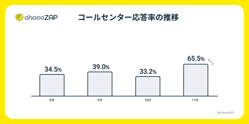 2025年11月度のコールセンターの応答率は65.5%となっております。より多くのお客様に快適にご利用いただけるよう、電話での対応に加え、チャットボットやサポートフォームによるお問い合わせ対応も行っております。