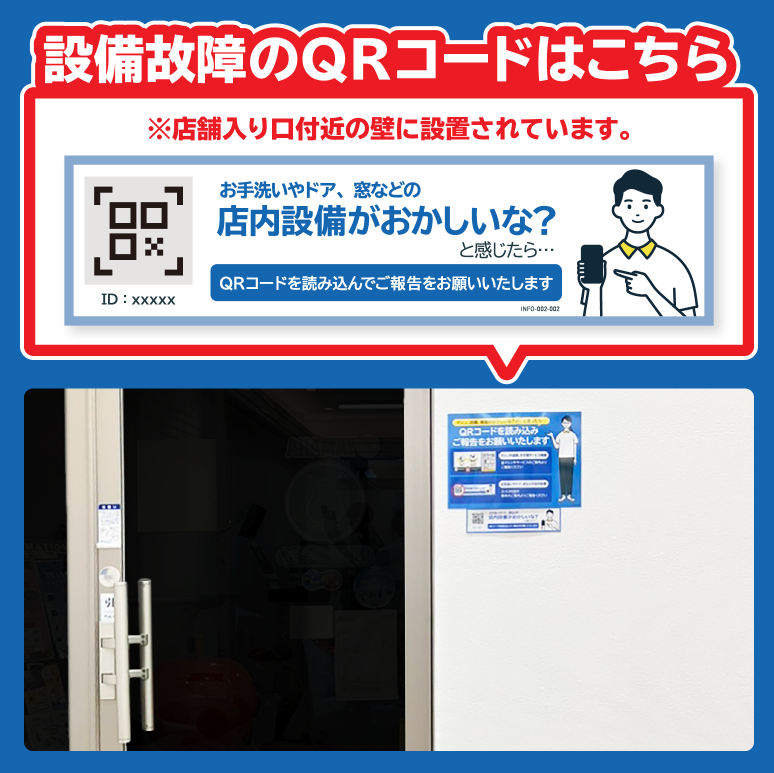 トイレやエアコン などの店舗内設備の故障/不具合や、スターターキットや各備品の補充に関しては、店舗入口付近/トイレ付近の壁に貼付されているQRコードよりご報告ください。