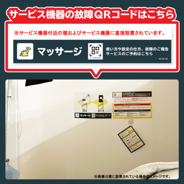 店内入口およびトイレ付近の壁に掲示されているQRコードから、設備不具合報告および備品補充依頼をお願いしています。なお、エステや脱毛等、サービス機器ごとの付属備品(ジェル 等)の不足は、サービスルームに設置されたマシン故障報告用QRコードよりご報告ください。
