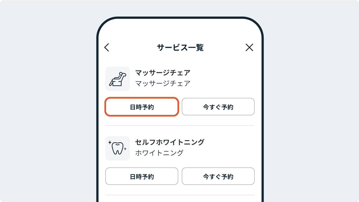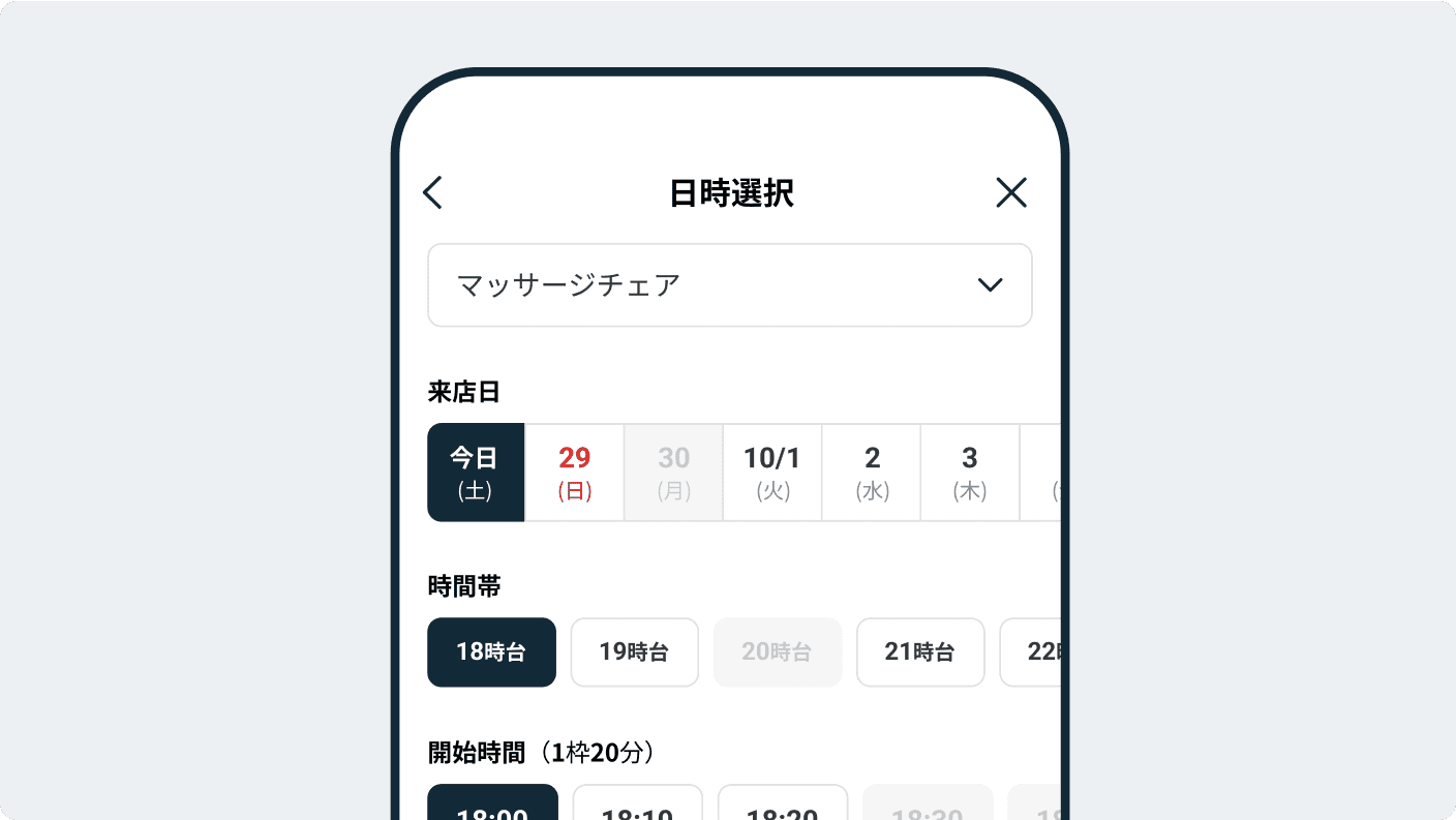 「店舗サービスの予約」の一覧で「マッサージチェア」を選択し、ご希望の時間帯をご予約ください。1枠20分で、各サービスの中から1日あたり最大4枠予約可能です。開始1分前まで予約・キャンセル手続きが可能です。