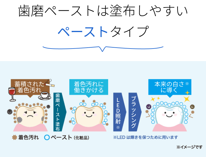 1回8分の専用LEDライトを照射しながら、オリジナル歯磨ペーストを併用した、ブラッシングにより汚れや黄ばみを除去することで生まれながらの自然な歯の色に近づけることができます。